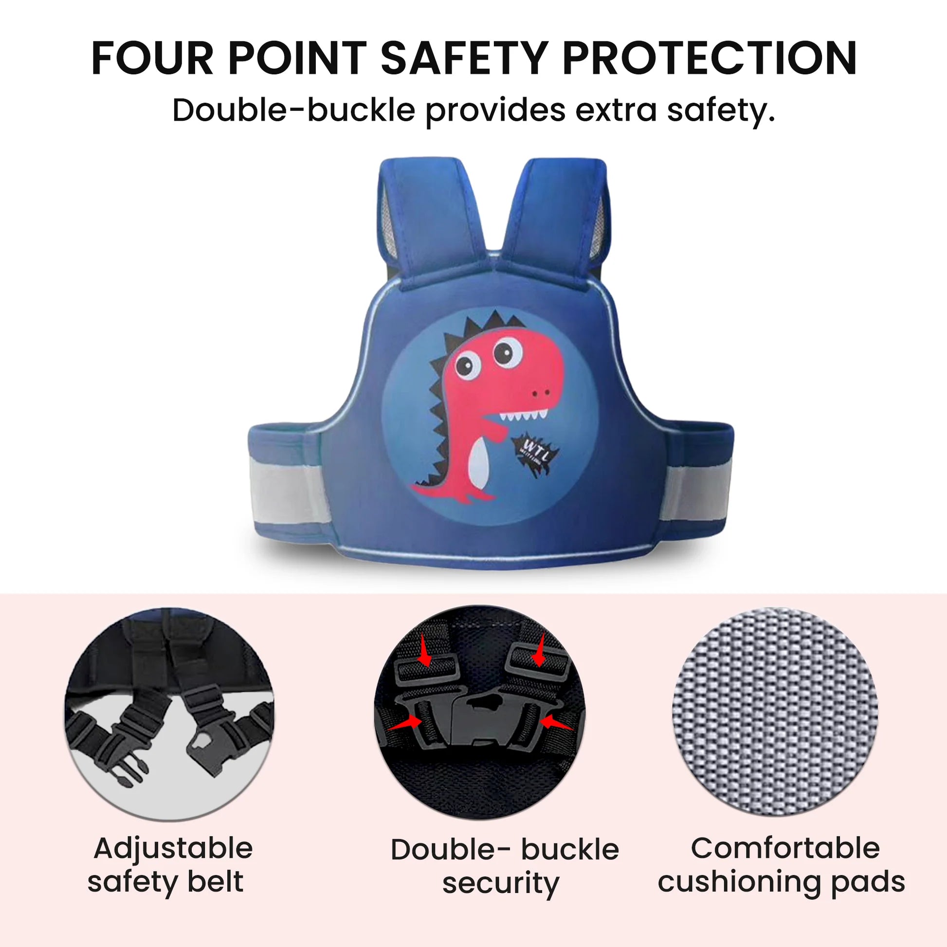 - Doble Hebilla de Seguridad: Equipado con cierres de alta resistencia que garantizan que el arnés no se suelte accidentalmente durante el trayecto