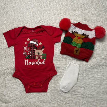 Celebra la primera Navidad de tu bebé con este adorable y festivo body. Confeccionado con algodón suave y cómodo, es perfecto para la piel sensible del bebé y lo mantiene abrigado. Presenta un estampado navideño vibrante con las palabras "Mi 1ª Navidad" y un diseño de reno y elementos festivos (árboles y estrellas). Los broches de presión reforzados en la entrepierna facilitan el cambio de pañal, y su diseño es ideal para fotos y celebraciones familiares.