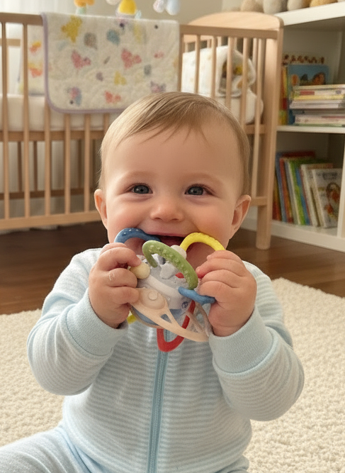 El Mordedor Sensorial TeetherBall 3m+ está diseñado para estimular los sentidos y aliviar las molestias del proceso de dentición. Su estructura redonda y flexible permite un fácil agarre, mientras que sus diferentes texturas y colores favorecen el desarrollo sensorial del bebé. Además, incluye un sonajero interno que emite suaves sonidos al moverlo, ayudando a mejorar la coordinación y la percepción auditiva.