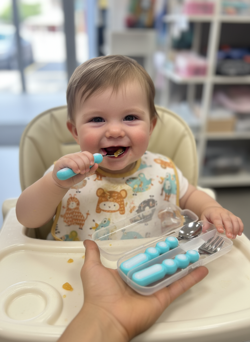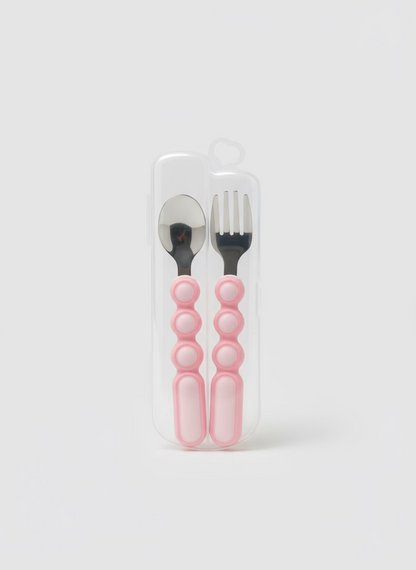 Este set de cubiertos entrenadores para bebé incluye una cuchara y un tenedor diseñados especialmente para las primeras etapas de alimentación.