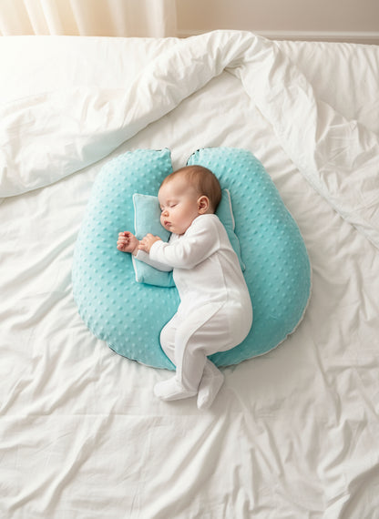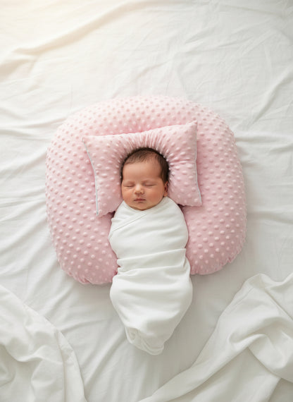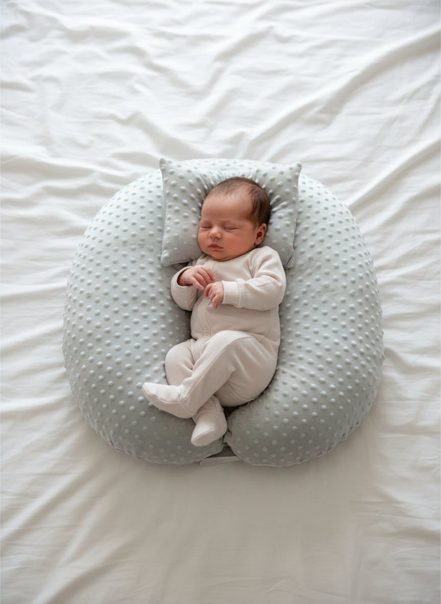 Cojín nido envolvente elaborado en suave tela minky, ideal para brindar comodidad y seguridad al bebé durante el descanso o los momentos de juego. Su forma ergonómica ayuda a mantener una postura natural, simulando el abrazo materno. Disponible en tonos celeste, gris y rosado. Fabricado con materiales hipoalergénicos, transpirables y fáciles de lavar. Perfecto para usar en cama, sofá o cuna.