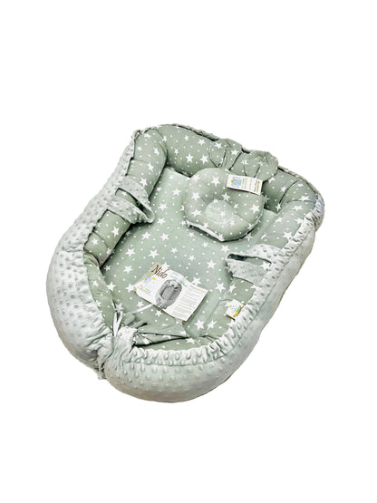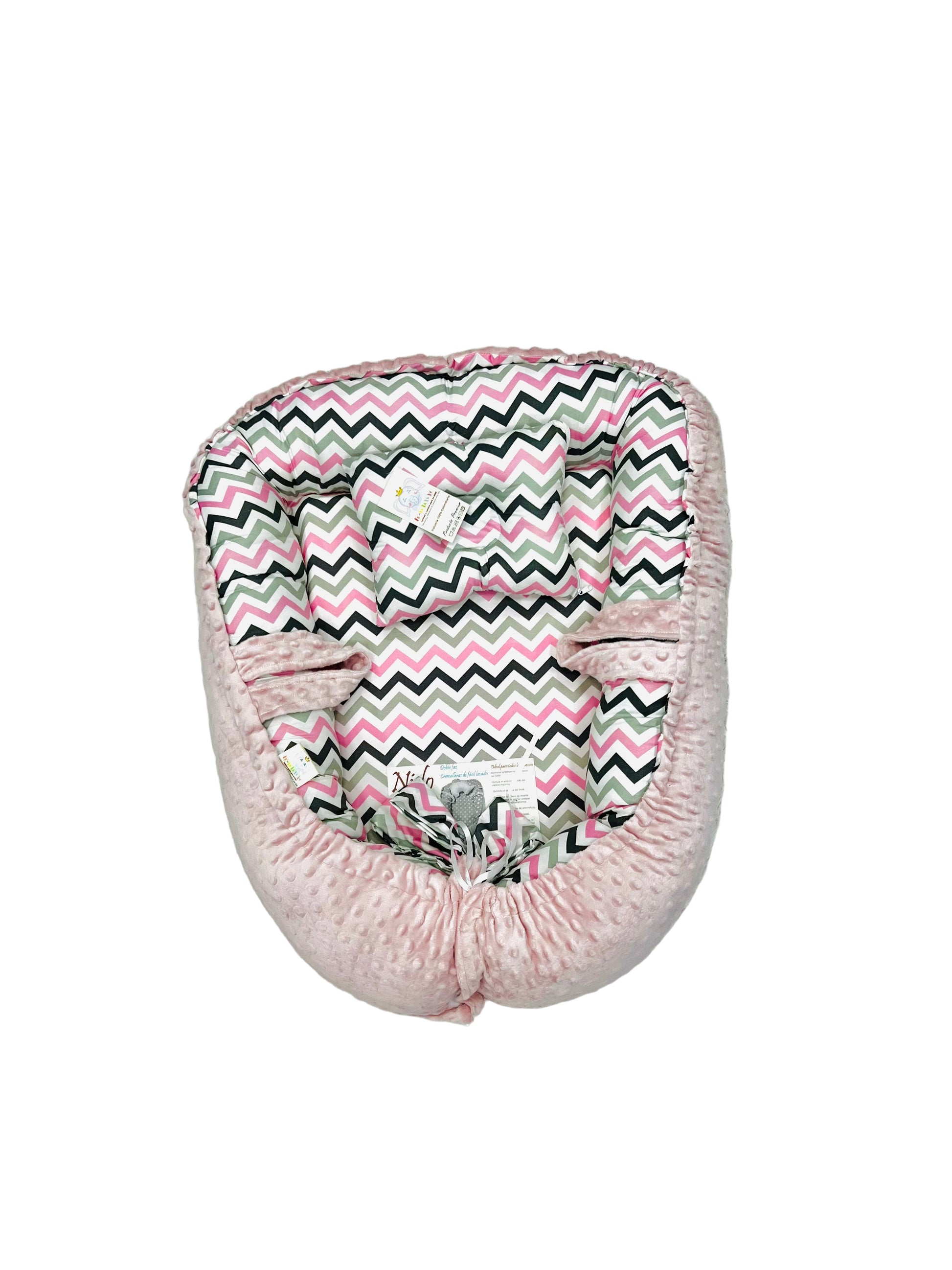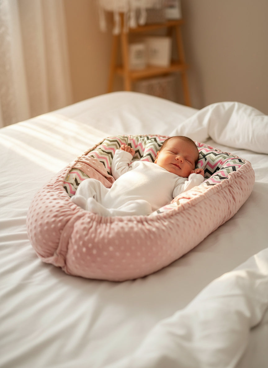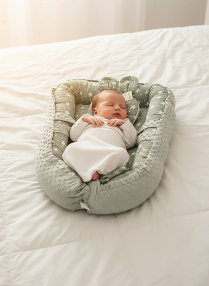 Este nido acolchado tipo capullo crea un espacio seguro, cálido y confortable para el descanso del bebé. Su diseño envolvente ofrece una sensación similar al abrazo materno, ayudando a calmar y favorecer un sueño profundo. Está fabricado con materiales suaves y transpirables, ideales para la delicada piel del recién nacido.