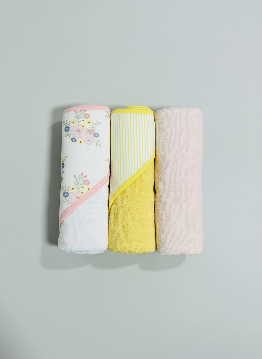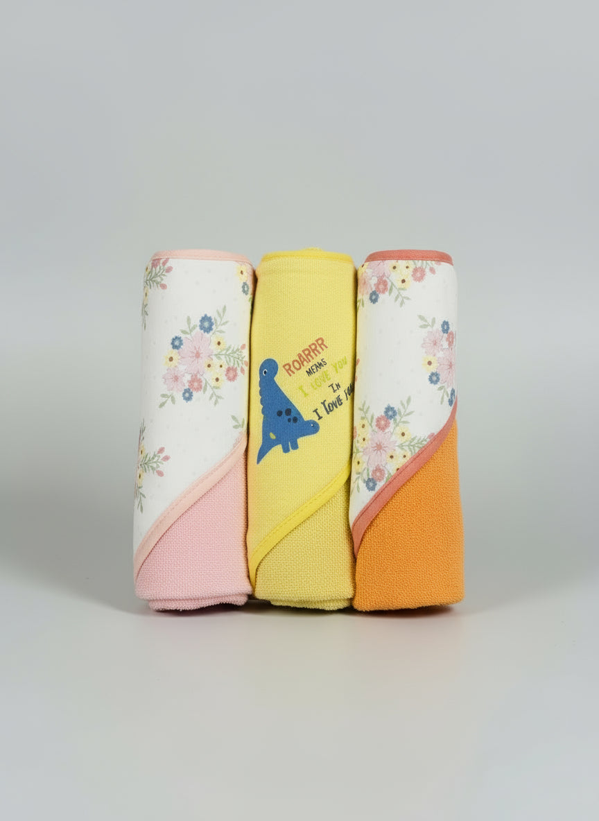Juego de tres suaves toallas ideales para envolver y secar al bebé después del baño. Con diseños tiernos y coloridos que combinan flores y dinosaurios.