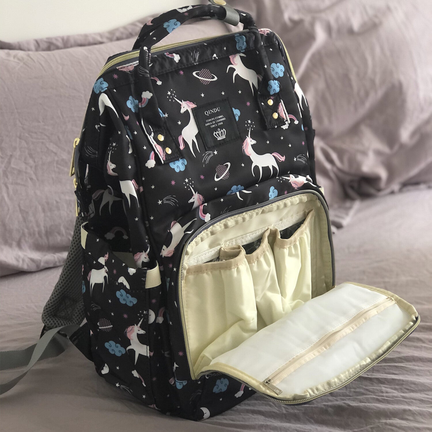Transporta todos los elementos esenciales de tu bebé con el máximo estilo y organización. Esta mochila pañalera de gran capacidad y apertura amplia (tipo "doctor bag") está fabricada con tela de nylon o poliéster resistente al agua y duradero, lo que facilita su limpieza. Cuenta con múltiples compartimentos internos, incluyendo bolsillos organizadores y tres compartimentos térmicos aislados en el bolsillo frontal para mantener los biberones a la temperatura ideal. Su diseño temático de unicornios y nubes es divertido y moderno.