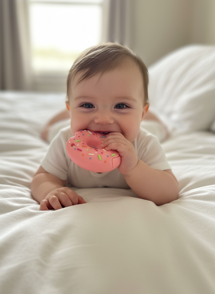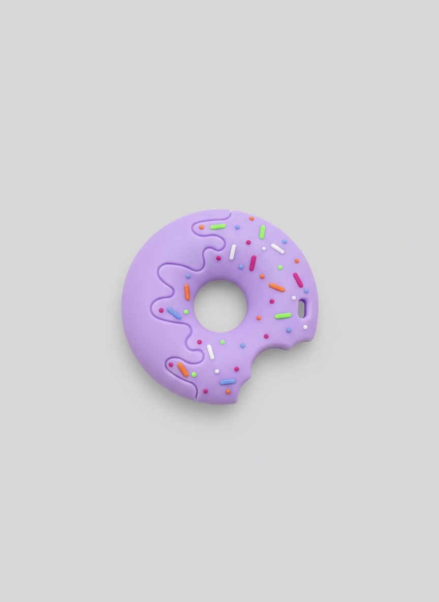 Este mordedor está diseñado para aliviar el dolor y la incomodidad de las encías durante la dentición. Fabricado con silicona de grado alimenticio de alta calidad, es totalmente seguro, libre de BPA y duradero. Su divertida forma de dona es fácil de sostener por las manos pequeñas. La textura del "glaseado" y las "chispas" proporciona una estimulación táctil y masajea suavemente las encías. Se presenta en un estuche individual y es higiénico y fácil de esterilizar.