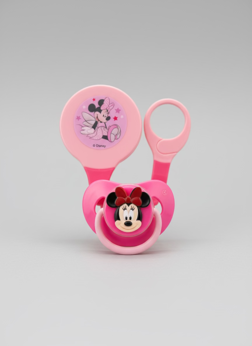 Mantén el chupete de tu bebé siempre limpio y al alcance con este set coordinado de chupete y sujeta-chupetes. El chupete cuenta con una tetina ortodóntica diseñada para el desarrollo saludable de la boca del bebé y está decorado con un divertido relieve de Minnie Mouse. Ambos artículos están fabricados con plásticos de alta resistencia y silicona, libres de BPA, asegurando un uso seguro y duradero. El clip sujetador se engancha fácilmente a la ropa para evitar caídas al suelo y pérdidas.